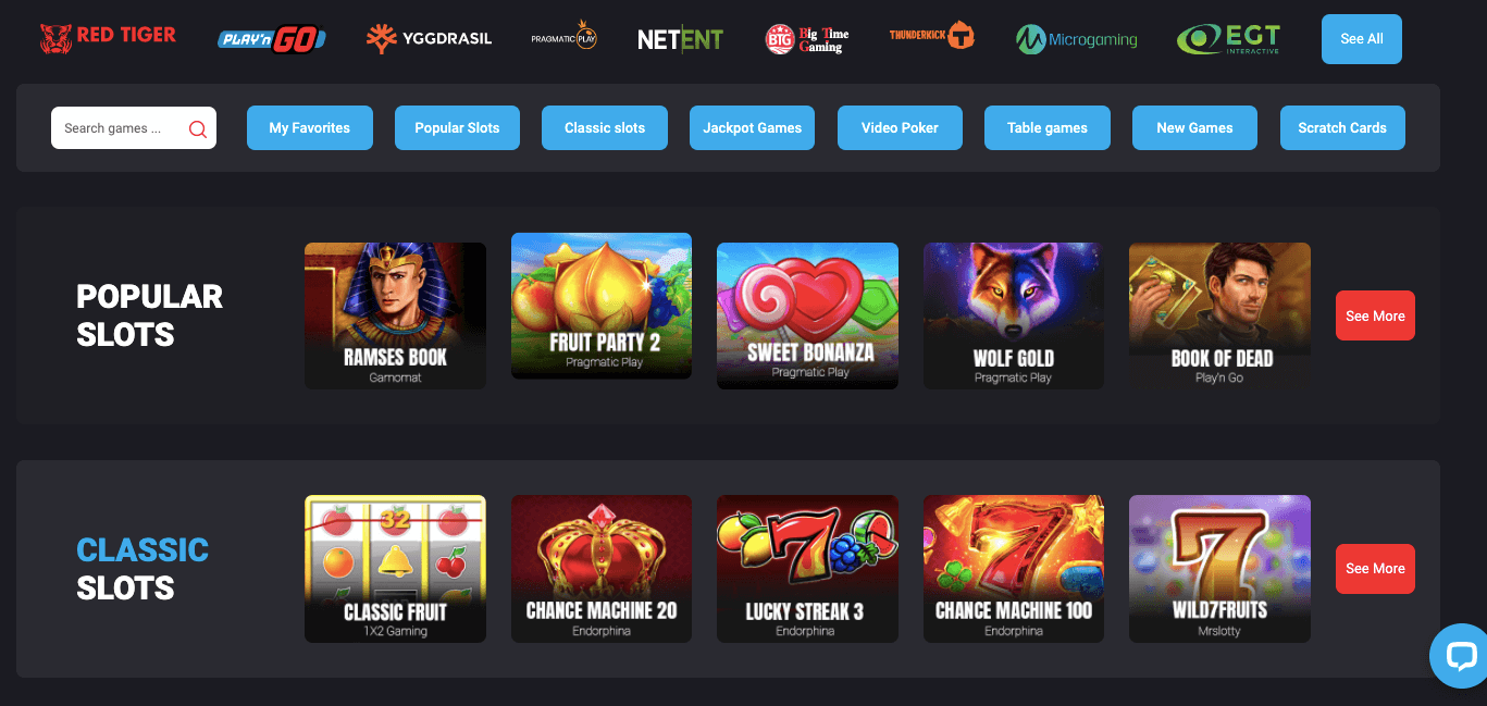 I fan delle slot machine avranno a disposizione migliaia di opzioni, dai classici da bar fino alle slot Megaways con grafica eccezionale. Non mancano i giochi da tavolo quali Roulette, Poker e Dadi, disponibili sia in versione software che nell’area Live Casino.
